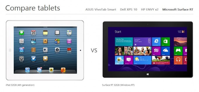 除了 iPad 外,亦有各式各樣的 Android 平板在市場上發售。近年 Microsoft 也積極推廣其 Windows RT 平板,並有少數廠商已加入其行列。為了讓用家認識 Windows RT 平板與 iPad 的分別,Microsoft 日前推出了一個比較網站,將目前市場上已售的 Windows RT 平板在規格上作比較。