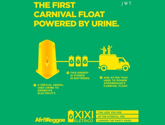 巴西里約熱內盧的嘉年華每年引來不少遊客和當地市民參與,大家盡情飲酒、派對狂歡,可惜飲酒過多亦造成通街小便的情況,為此有非牟利機構想出一石二鳥的對策。利用小便的力量發電,為嘉年華的花車提供電力。 http://youtu.be/dMQvGzhE7pc 非牟利組織 AfroReggae 跟廣告公司 JWT 合作,在嘉年華會場附近擺放多個流動廁所,當小便通過尿兜內的裝置,就會產生電力並儲存在儲電池內。而電池就會給予嘉年華的派對花車,提供源源不絕的音樂。這個方案既可解決隨處便溺的問題,同時又為會場增添氣氛,可謂一舉兩得。 來源:PSFK