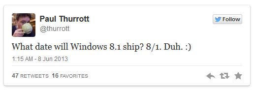 根據熟悉 Microsoft 運作的 SuperSite 網主 Paul Thurrott 在 Twitter 上透露指出,Windows 8.1 有機會在 8 月 1 日正式推出。隨後有其他科技公司表示應該是 10 月 14 日,但 Thurrott 則表示其消息來源也十分準確,即提早了個半月時間登場。Thurrott 亦表示,Windows Phone 8.1 也會隨後更新,但時間會是明年初,由於 Windows Phone 8.1 與 Windows RT 也採用相近核心,不知道是否也代表 Windows RT 8.1 也會推遲?還是與 Windows 8.1 一併推出呢?