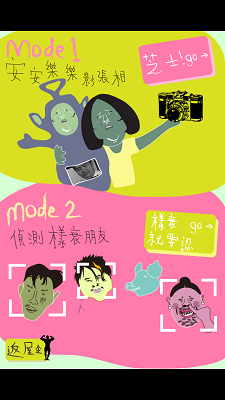 之後就試下 mode 2 啦!一開始就睇到一段好傷人自尊的句子,大家不要灰心,其實這個相機探測到人樣就會「玩」你,自動用樣衰貼紙遮住你的臉,自己無得選擇,它會隨機用一個貼紙遮住你的臉。