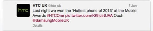有獎攞本應好興奮,點知 hTC 和 Samsung 竟然會因此變成小學雞,在 Twitter 吵大鑊,究竟誰是誰非,不如由讀者評評理。事緣日前英國舉行了 Mobile Awards 頒獎典禮,hTC One 當晚得到了 Hottest Phone of 2013 獎項,於是就在自己的 Twitter 帳號公布喜訊,順道寸一下 Samsung(見下圖)。