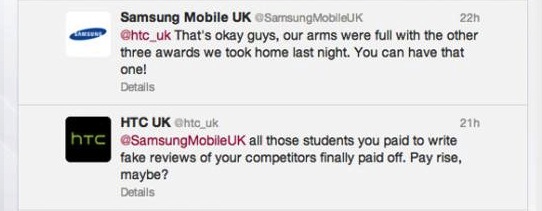 原本只是自己報喜問題不大,但 hTC 竟然寫著「哎唷!」然後 tag 了 Samsung;Samsung 也不是省油的燈,轉頭就回應指,我們當晚攞咗 3 個獎項,呢個豬肉獎留俾你啦!hTC 見到後當然不爽,擺明針對 Samsung 搵學生上網做打手,明寸 Samsung「所有學生打手寫衰對手的功夫終於有回報啦!今次你哋仲唔加人工?」