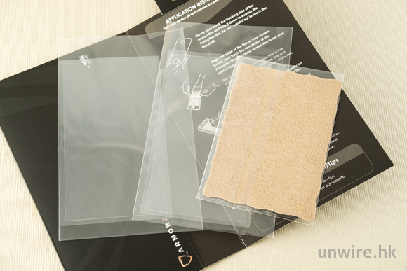 ▼ HTC One 版本的 Armorz Anti-Fingerprint Protective film 包裝內附有 2 張一式一樣的保護貼,可 2 部機同時使用,也附有 1 塊抹布,在安裝前可先為屏幕作最後清潔。