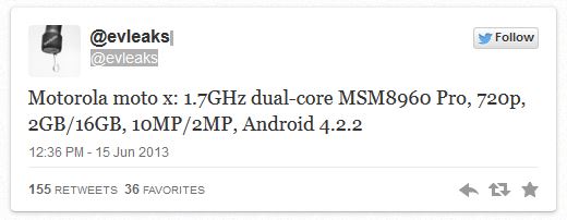根據多次透露新手機消息的 Twitter 用家 @evleaks 透露,Moto X 將採用 4.x 吋 HD (1280 x 720) 屏幕,配有 1.7GHz 雙核心處理器、2GB 記憶體、16GB 儲存空間、1000 萬及 200 萬像素後置及前置鏡頭,並搭載 Android 4.2.2 系統。唯一較特別的是其內建的圖型處理核心升級至更高級的 Adreno 320,但整體上與現時一般的中階機無大分別,沒有 Full HD 屏幕及四核心處理器,也沒有更多的儲存空間。雖然「親生仔」推出的目的是現給開發者提供一個參考平台,但以這遲來的真正「親生仔」來說,連 Nexus 4 也不如,似乎有點過份了。