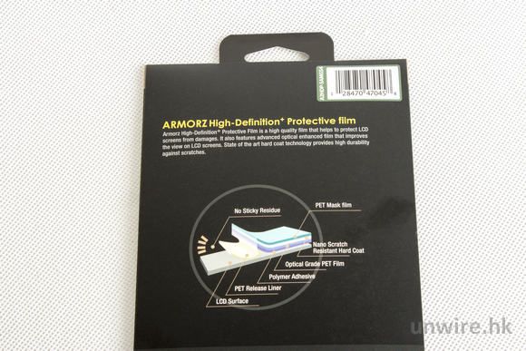 與同牌子另一款防指紋的保護貼一樣,Armorz HD+ 超高清保護貼也配有奈米級的防刮塗層作保護,再與特別的 PET 材料作配搭,也能夠做到面油、塵埃等附於保護貼表面,可輕輕一抹也保護貼回復光彩。同樣地保護貼也能夠抵受一般的硬物及刮痕沖擊,其效果與防指紋保護貼相近可達 3H 至 4H 硬度保護能力,可免受鎖匙、硬幣等硬物刮花,一起放到褲袋內亦可,當然也不建議兩者放在一起吧!