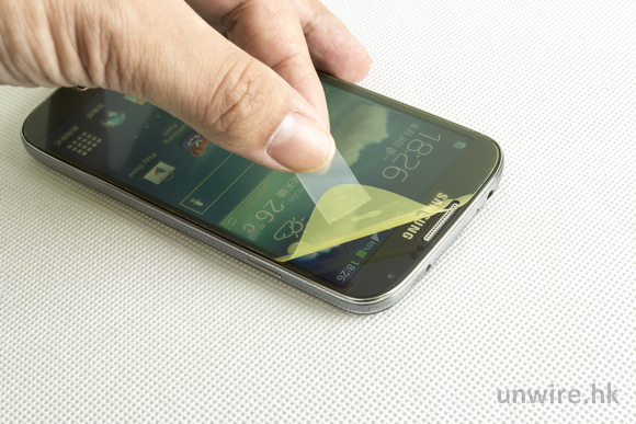 ▼ 以 Samsung Galaxy S4 作示範,先將一邊的膠貼除下,然後慢慢對位貼到屏幕上。