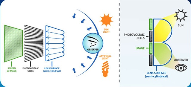 太陽能技術發展多年,其轉換效率仍然不高,但也足夠推動細小裝置。法國的 SunPartner 就想出另類應用太陽能面板方法,並研發出可接收太陽能的特別屏幕。此技術的原理是將現有的屏幕加入 Photovoltaic Cells 設計,即將太陽能轉換成電力的微小元件,並在表層上覆蓋微型的半圓透鏡提升接收太陽效率,從而進一步加快電量轉換能力。