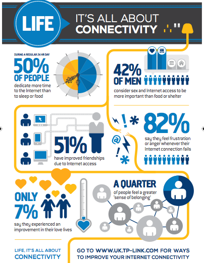 TP-LINK 早前在英國和愛爾蘭中訪問了 3000 名 18-55 歲的男性及女性,調查他們的上網價值觀,結果顯示大部份人願意投放更多時間上網,甚至比食物及睡眠更加重要,比你選擇你又會怎選擇呢?