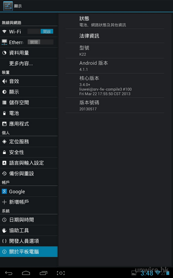 ▼ 型號為 K22,版本號碼為 20130517,相信也是出廠日期,預裝了 Android 4.1.1 系統。