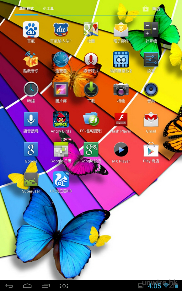▼ 藍晨 K22 採用 Android 4.1.1 系統,預設的 Wallpaper 可凸顯其 IPS 屏幕色彩。而預裝 App 有百度、百度輸入法、Angry Birds、Flash Player、MX Player、貓頭鷹播放器、酷我音樂、UC 瀏覽器等等,當然用家也可透過 Google Play 自行安裝不同 App,而它本身「已 Root」了機,大大節省需 Root 機用家的時間。