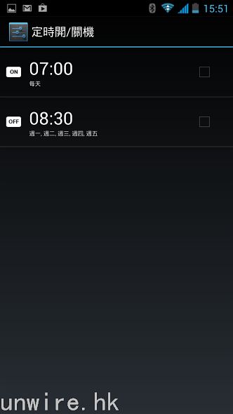 它內置定時開關機功能,用家可透過它令裝置更省電,另外亦方便一些將手機當鬧鐘使用的用家,用家可在睡眠時關掉手機,到睡醒的時自動開機再啟動鬧鐘相當方便。