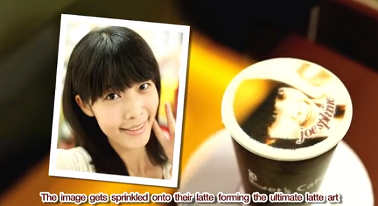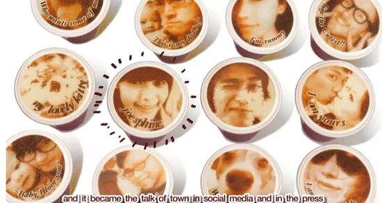 這個 Let’s Cafe 的主意,令用家可在連鎖便利店 FamilyMart 內的咖啡售賣亭買到。這些個人化的咖啡的製作過程是當客人叫一杯咖啡,可用手機選一張照片,然後把照片傳送至機器,機器就在泡沫頂加上可食用的啡色粉把照片印出來,咖啡從機器出來時已經有你的樣子啦!