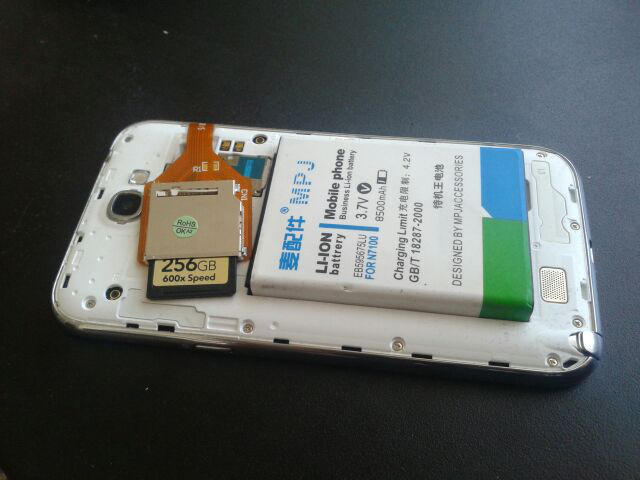 有位使用雙 SIM 卡的 Galaxy Note II 用家對愛機進行改裝,包括購買 microSD 和 SD 轉插 (27 美元)、256GB Lexar 600x SDXC UHS-I 記憶卡 (999.99 美元)、8500mAh 電池 (17 美元)。後來這用家又換了顆 9300mAh 的電池 (45 美元) 和 ZeroLemon 的 288GB 記憶卡。