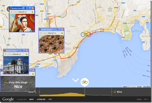 用家只要進入「Your Tour」互動網站,就可在線上體驗風景宜人的單車賽道,除了本月舉行的幾條法國賽道會逐步開放外,還提供歷史上著名的幾條環法單車比賽賽道。「Google Your Tour」互動網站結合了 Google 的多項線上服務,包含 Google 地圖街景、 Google+ 即時資訊、YouTube 影音等,整合成一個互動的體驗遊戲。