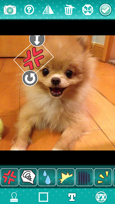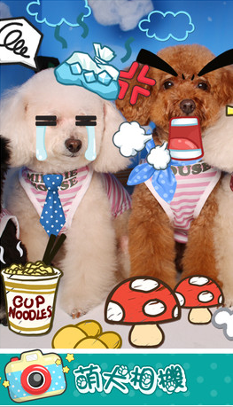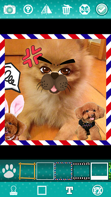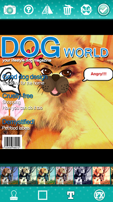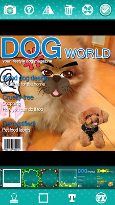或者大家可用已拍好的照片加工,按下掛左二的 icon 可以開始加工照片,有好多得意貼紙和相框,其中小妹最鍾意是雜誌封面!另外有 3 個狗仔的照片,大家可用作貼紙,使效果好像自己的狗仔跟其他狗合照。之後可加入文字、濾鏡。