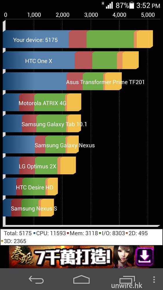 ▼ Quadrant Standard 是 5,175 分,效能比 NVIDIA Tegra 3 的 4 核處理器好。