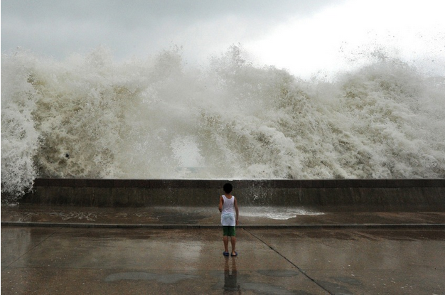 一個小孩在看颱風 Bolaven 引起的浪。