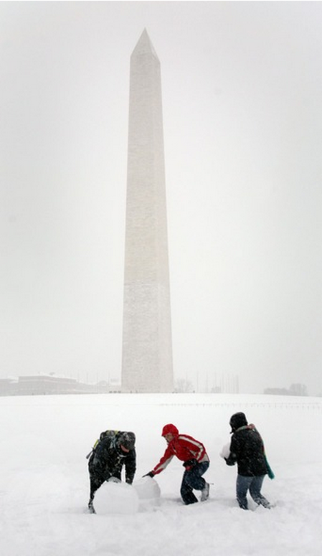 3 個人在暴風雪下在 Washington Monument 前堆雪,當時風雪掩蓋了城市。