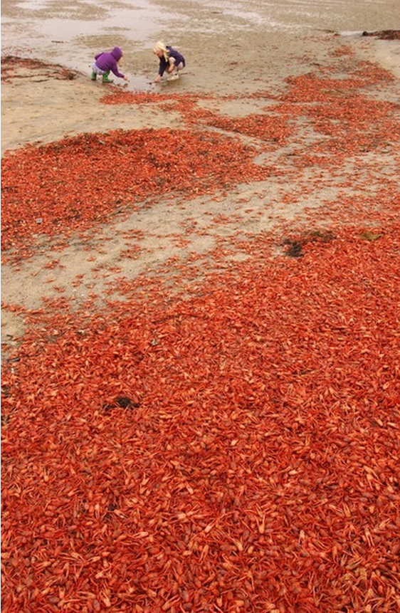 一群紅蟹衝上岸去,這是厄爾尼諾現象的先兆。