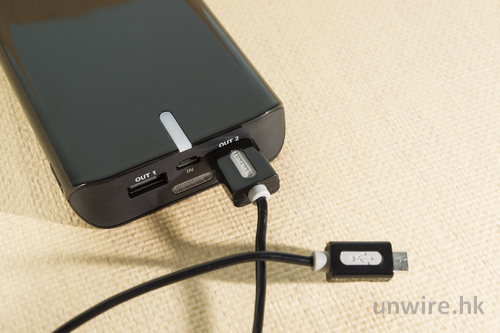 ▼ 附送的 USB 線為裝置充電時就將「大頭」插到機身上,另一邊「細頭」則放到裝置端,為充電器充電則掉轉安裝便可。