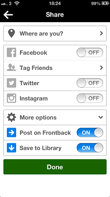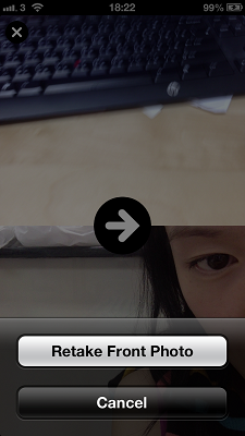 你需要的 iOS App 是 “Frontback”,你會見到拍攝的版頁分上下兩層,上層是向外的鏡頭用的,大家先用外面鏡頭拍攝點撃屏幕即可,之後自動跳去下格並用自拍的鏡頭拍攝,同樣點撃屏幕拍攝就可完成拍照啦!可按箭咀選擇分享出去或儲存。