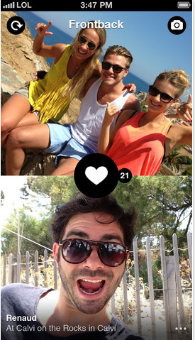 你需要的 iOS App 是 “Frontback”,你會見到拍攝的版頁分上下兩層,上層是向外的鏡頭用的,大家先用外面鏡頭拍攝點撃屏幕即可,之後自動跳去下格並用自拍的鏡頭拍攝,同樣點撃屏幕拍攝就可完成拍照啦!可按箭咀選擇分享出去或儲存。