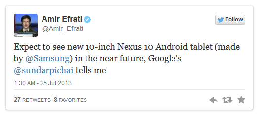 根據華爾街日報記者 Amir Efrati 引述 Google 副總裁 Sundar Pichai 的消息指出,Google 與 Samsung 目前正在為下一代 Nexus 10 作出努力,進一步提升效能及用戶體驗。目前 Nexus 10 已經具備 2560 x 1600 超高解像度屏幕設計,用上雙核心 A15 SoC,預計將會改用更強大的四核心甚至乎八核心 SoC,搭載更強大的 GPU 提升效能,預計也會升級至 4G LTE 支援。消息指 Nexus 10 也會搭載最新的 Android 5.0 一起供貨,提升各項操作體驗,但目前未有透露規格詳情。如果以目前 Android 5.0 的進度去推斷,可能 10 月一併推出也不定。