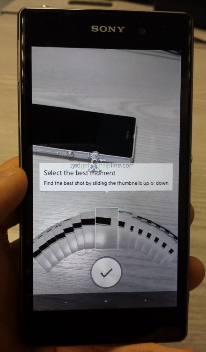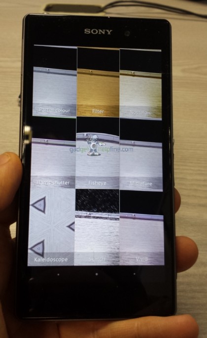 Sony i1 的重點是其 Cybershot 相機功能整合,操作介面也重新設計,變成了 Android App 的一部分。從圖片上可以見到有 Superior auto、Manual、Timeshift burst、Picture effect、AR effect、info-eye、Social-live 及 Sweep Panorama 等功能,Timeeshift burst 有著類似 HTC Zoe 的 Time shift 功能,Picture effect 也可以即時選擇相片效果等。而最特別是 AR effect 設計,可以將預設的不同立體影像與相片結合起來,示範中就將立體恐龍變成相片的一部分,手機不單只是像素大幅提升「咁簡單」,相機功能也較一般的 Android 手機更好玩。