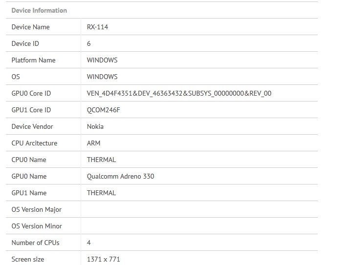 根據 GFXBench 的資料顯示,型號為 RX-114 的 Nokia 平板採用了 Adreno 330 GPU,也是 Snapdragon 800 SoC 暫時的獨有設計,還有 1371 x 771 屏幕,以比例計就是 1920 x 1080 FullHD 解像度,與 Surface Pro 的資料相同。消息指 Nokia 早前停止了 Windows RT 平板開發轉為 Windwos 8,但此型號採用 ARM 處理器相信會仍是運行 Windows RT,據知 Nokia 是要配合 Windows RT 8.1 正式推出後才會發布平板產品,如果屬實的話,應該會最快會在 10 月左右便會正式推出。