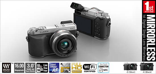 Panasonic LUMIX GX7 是 GX1 的後繼機種,GX 系列主打專業級市場,定位也走向高階。GX7 的外觀及設計也是截然不同,走向 Rangerfinder 款式路線,新加入可 90 度垂直的 LVF (Live View Finder) 電子觀景器,不再需要額外購買。其 LVF 擁有 276 萬超高解像度設計,可以放大至 1.39 倍方便對焦,也提供 Eye Sensor AF 功能,眼睛貼近 LVF 時便會幫你自動對焦,LCD 屏幕則保留 3 吋 104 萬像素設計。另外 GX7 也加入了時下流行的峰值對焦設計,手動對焦時會有顏色顯示。