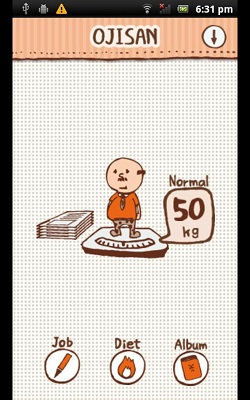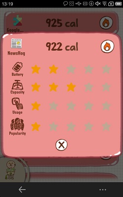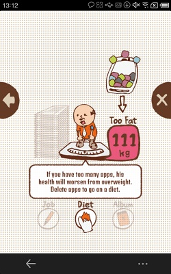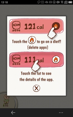 這個 App 叫「手機電池的壽命」,用個可愛大叔做介面!他就代表你的手機,介面會顯示他的重量,大叔如果 60 多 kg 屬正常,如果 80-90 kg 就有點重啦!要刪除一些 app 先可幫他減肥,在 app 內按 diet 就看到你手機內有什麼 app,並有 app 的卡路里,卡路里用來表示 app 所佔容量比例,按一下卡路里數字可以睇到 app 的詳情,刪除 app 後,關掉大叔 app 再開啟,就見到大叔輕了啦!