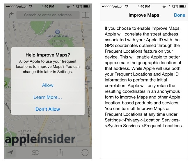 另一方面 Apple 亦明白群眾力量的厲害,在 iOS 7 中 Apple 會在地圖加入「Help Improve Maps」選項,要求 iOS 用戶協助改善地圖資訊,用戶的儲存的地圖位置會上傳到 iCloud 並和 Apple ID 連結,有助 Apple 提供更精準的地圖資訊。