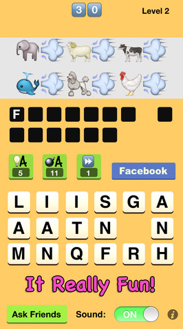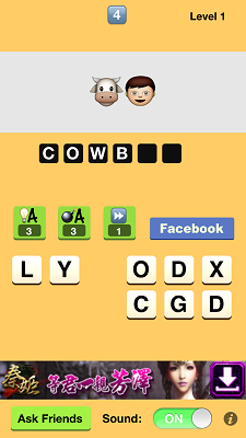 這個 app 叫 “表情符號高手 – Emoji Ace”,遊戲就是見到圖案就估字啦!真的估不到了?可以把圖案拍下傳送給朋友幫幫忙一齊想,如果還是想不通的話,就可以用燈泡、炸彈、Skip 等道具,燈泡可以為你揭示一個字母,玩家有 3 次使用機會;炸彈可以幫你在下面的字中減少一個字母,縮小範圍,有 3 次使用機會;Skip 就是去下一題,只可用一次,用完後大家有需要的話就要付費購買啦!