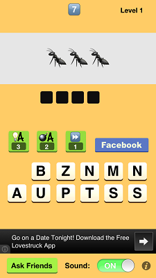 這個 app 叫 “表情符號高手 – Emoji Ace”,遊戲就是見到圖案就估字啦!真的估不到了?可以把圖案拍下傳送給朋友幫幫忙一齊想,如果還是想不通的話,就可以用燈泡、炸彈、Skip 等道具,燈泡可以為你揭示一個字母,玩家有 3 次使用機會;炸彈可以幫你在下面的字中減少一個字母,縮小範圍,有 3 次使用機會;Skip 就是去下一題,只可用一次,用完後大家有需要的話就要付費購買啦!