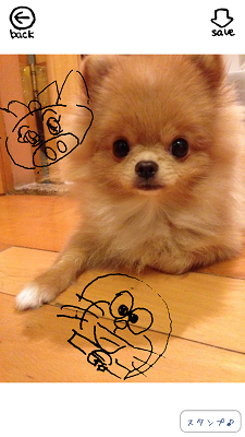 小妹畫極都…… 所以叫同事幫手畫!完成貼紙的製作並儲存後,就出去目錄,按第 3 個選項,又拍一張照片或在相簿選一張照片,之後就可在照片上貼上之前整的 Sticker 裝飾啦!Sticker 可以校大縮少或 360 度移動。