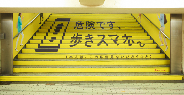 這 Docomo 的地鐵站廣告出現在 JR 新宿站往月台的樓梯,在樓梯寫著:「一邊行一邊用智能手機十分危險。(不過,這些人應該看不見這廣告)」,而在樓梯兩旁則分別有:「一邊行一邊用智能手機機,人人都要避開你」和「就算你看不見這廣告,希望你也察覺到途人的冷眼」。