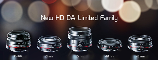 Ricoh 日前發布的 5 支 HD Pentax DA Limited 系列新鏡頭,全部清一色為定焦鏡,專為 Pentax K-Mount DSLR 相機而設,包括了 15mm F4 ED AL Limited、21mm F3.2 AL Limited、35mm F2.8 Macro Limited、40mm F2.8 Limited 及 70mm F2.4 Limited,全部只是舊酒新瓶。5 支新鏡頭均以 HD 塗層為賣點,並改用圓形光圈葉設計令散景更為完全,有黑色及銀色可供用家選擇,相信是取代目前的 SMC DA 舊鏡,不過 5 支鏡頭均再沒有 Pentax 字眼,大家所熟悉的綠圈也變成了紅圈,一切招牌特點也完全被抹除,15mm F4 及 21mm F3.2 兩支鏡頭的 7 邊形 14 條星芒相信也成過去,不知道各位「笨仔」用家又有何看法呢?