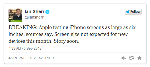 Apple 即將發布 iPhone 5S 及 5C 兩款新手機,下一代型號相信也正在同步研發之中。有消息指 Apple 內部正在測試 6 吋屏幕機種,有機會是下一代 iPhone 或其變種的原型機。