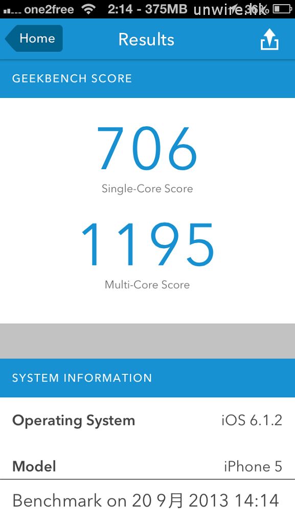 ▲Geekbench 3:iPhone 5 – Single Core 分數(706 分)/ Multi-Core 分數(1,195 分); iPhone 5s – Single Core 分數(1,414 分)/ Multi-Core 分數(2,557 分)。
