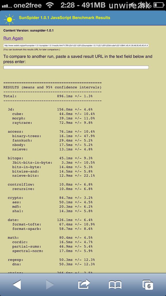 ▲Sunspider:iPhone 5 – 896.1ms; iPhone 5s – 454.5ms。