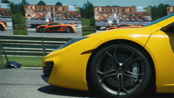 不過 Microsoft 並不是將 McLaren 12C 擺擺甫士,或者拍攝它的速度感般行貨。廣告製作團隊在賽道上豎立了 680 塊鋁製廣告版,貼滿一格格 Forza 5 遊戲畫面的圖像,在車頂安裝了高清攝影機,利用 McLaren 12C 接近 200 公里的時速,模擬出 30 FPS 的遊戲畫面。