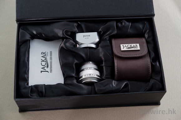 ▲ 包裝盒內附送了 1 個不錯的皮套,可直接將已安裝了遮光罩的 Jackar 34mm f/1.8 鏡頭直接放入,十分方便。