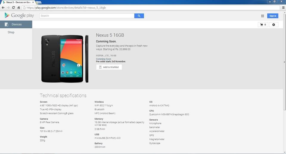 根據早前印度 Google Play 漏出的官方資料知道,Nexus 5 將會採用 4.95 吋 Full HD 屏幕,其密度達到 441 ppi,即與 Apple 的 Retina 屏幕同級,並用上 True HD IPS+ 技術及新一代康寧防刮玻璃設計。其「大腦」為 Snapdragon 800 SoC,即與目前不少旗艦機同級,配上 2GB 記憶體及 16GB 儲存空間,還有 800 萬像素鏡頭、802.11b/g/n、NFC、Bluetooth 等等,電池容量為 2,300mAh。機身方面為 131.9 x 68.2 x 7.25mm,較上一代 Nexus 4 的 133.9 x 68.7 x 9.1mm 體積更細,亦明顯地薄身得多,但不要忘記屏幕也大了近 3 吋