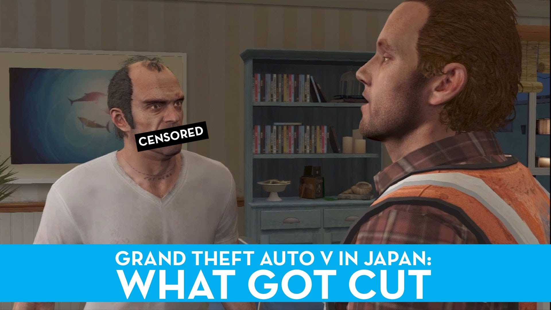 當中極端例子包括外國版 Trevor 在某情節會露出「蛋蛋」,但日本版則著住長褲。另一例子 1 名女明星跟人發生「重口味」性行為被偷拍,在日本版竟然變成女明星食煙被偷拍。而遊戲內虐待囚犯的情節亦被「河蟹」。下面有 2 個版本的對照,提提讀者們內容有成人情節。