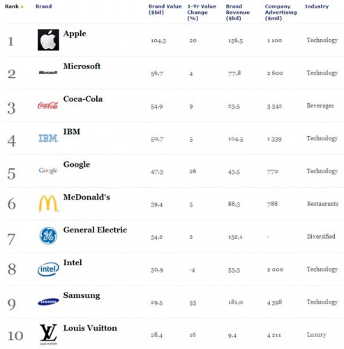 根據福布斯的估計,Apple 的品牌價值達到 104.3 億美元,比起去年同期上升了 20%,它的品牌價值差不多是其他品牌的一倍。9 月排行榜佔第 2 位的 Google 被 Microsoft 所取代,甚至比 IBM 還要低。10 大排名中,電子科技公司佔了 7 間,當中排名第 9 位的 Samsung,雖然是 10 大中排名最低的科技公司,但它的品牌價值卻是排行榜 100 個品牌中上升幅度最大的,上升了 53%,現在估計約值 29.5 億美元。