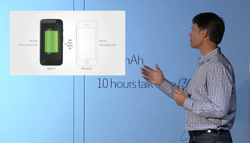 雖然屏幕較大,但其續航力也是賣點,Moto G 內置了 2,070mAh 不可更換式電池,提供 14 小時 3G 通話時間,比起 iPhone 5s (1,560mAh) 的 10 小時多 33%,以 Moto G 大概多 25% 電池容量但多 33% 通話時間去比較,看起來 Moto G 更為省電。