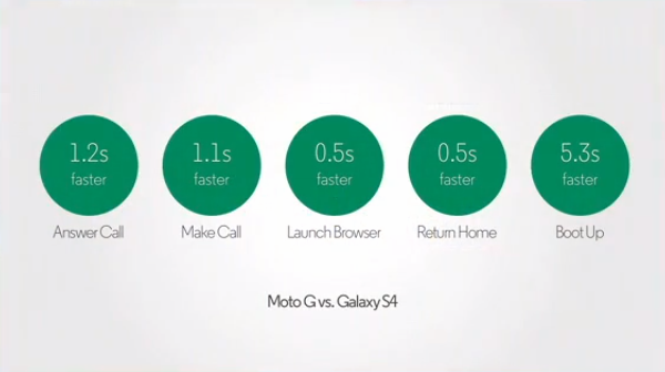 不過 Moto G 出廠時預裝的仍是 Android 4.3,也有自家的客制化 App 附送,另外也會附送 65GB Google Drive (官網已作出更新是 50GB) 儲存空間。Motorola 表示日後也會提供升級,其中 Android 4.4 會在明年一月左右推出。Motorola 也表示設計也作出效能優化,比起 Galaxy S4 部分應用更好。如接電話可以快 1.2 秒,打電話快 1.1 秒等等,也可以像 Samsung TouchWiz 或 HTC Sense 般自定不同 Skins,提供更多使用彈性。