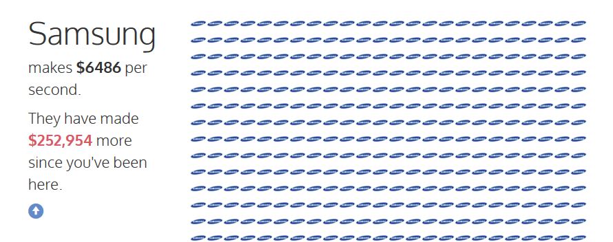 網站 happier.co.uk 就將各大主要科技公司的年收入轉換成秒數,從而得出每秒的賺錢能力。Samsung 以 6,486 美元位居榜首,成為最能賺錢的科技公司,梗次於 Samsung 則是 Apple,但只有 4,540 美元,第三名為 Apple 的主要代工廠 Foxconn,賺錢能力為 3,815 美元,而 Facebook 及 Blackberry 原來只有 230 美元及 205 美元,Nokia 也以 941 美元勝過他們,可見 Nokia 產品雖然少了用家,但仍有不錯收入。若想計算自己每秒鐘賺多少錢,其實也是很簡單的,小編就發現自己只值分亳,真的有點傷心傷感。