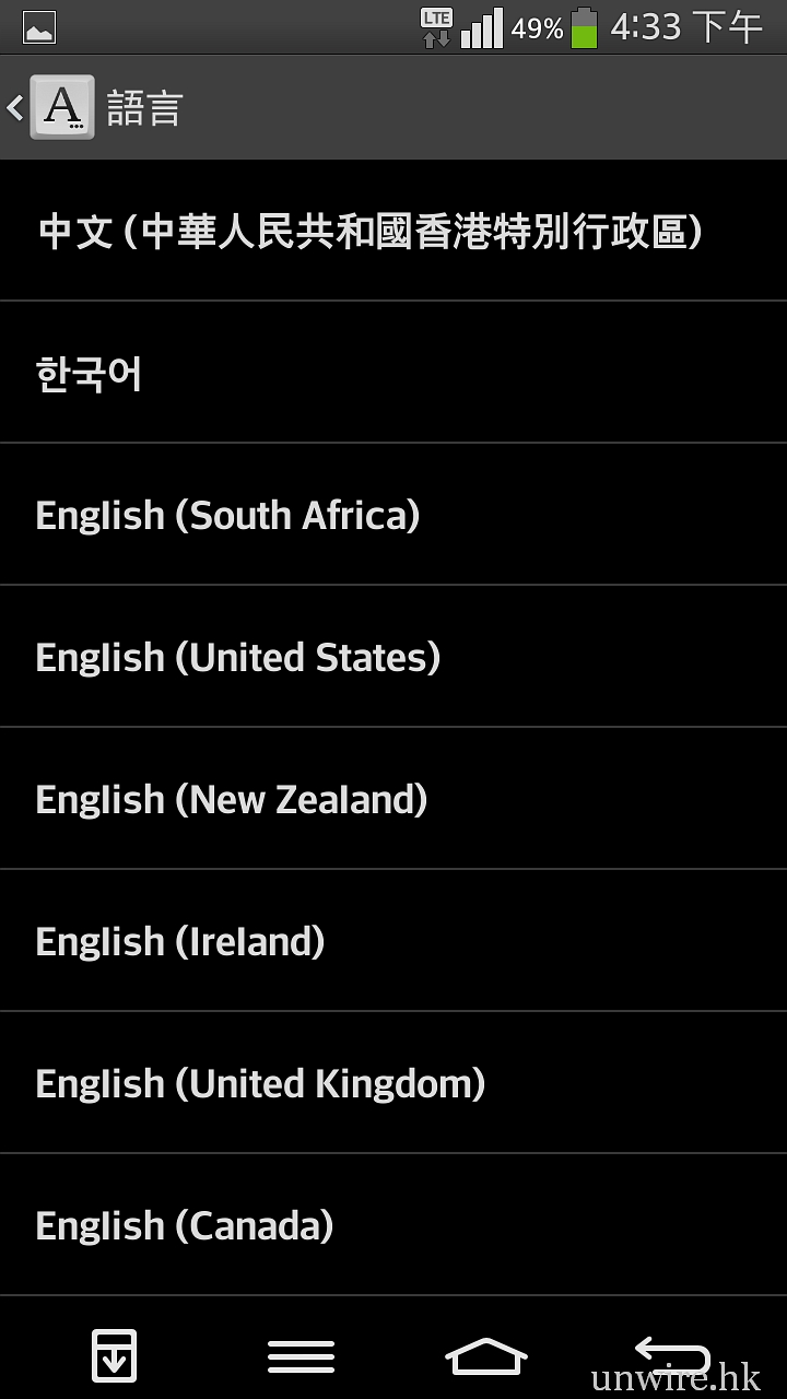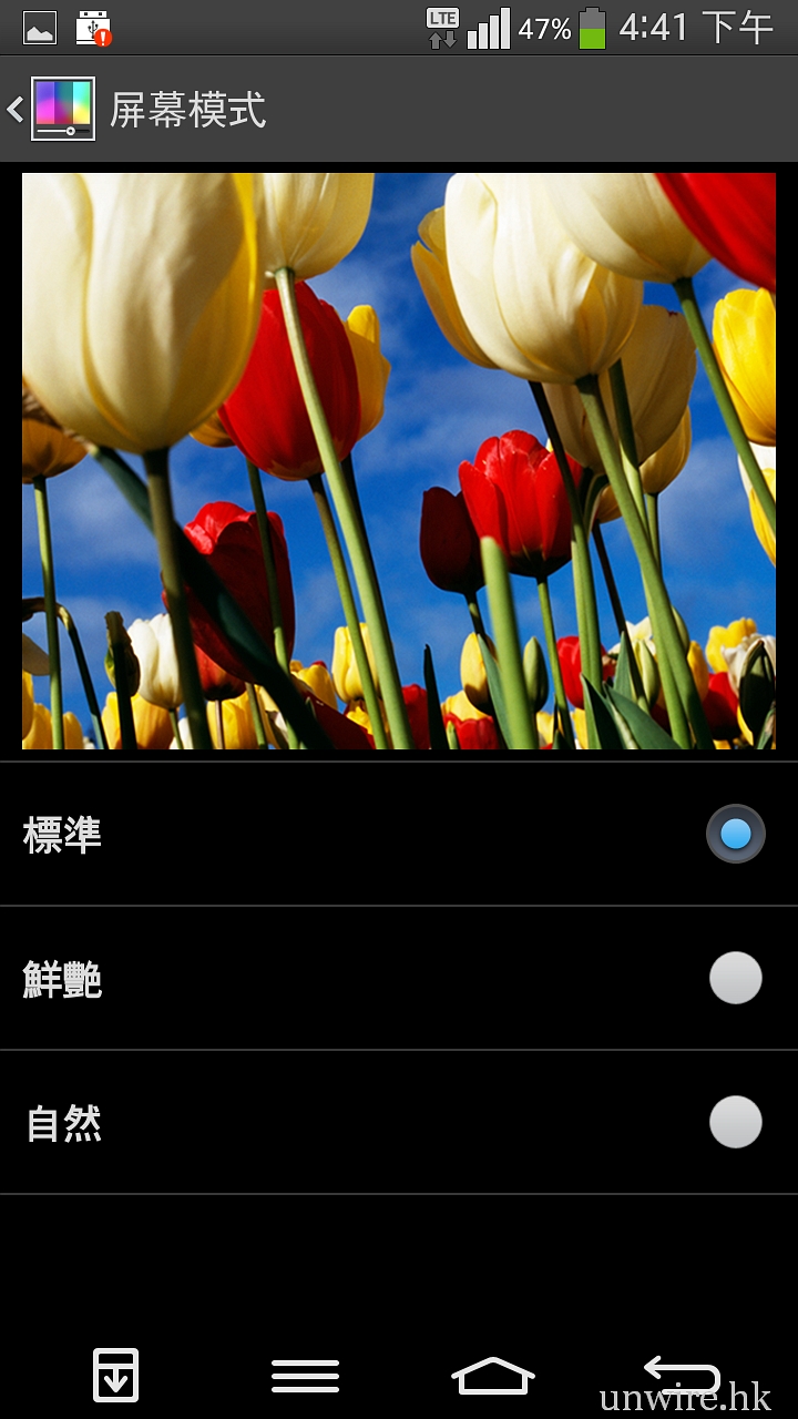 這次測試的 LG G Flex 屬韓國水貨(型號為 F340S),但系統仍支援多國語言,包括:中、英文,預載 Android 4.2 及 Optimus UI 介面,並附設 Q Memo、Q Slide 及 Q Remote 等預載程式,操作起來跟 G2 沒大分別。至於 G Flex 獨有設定,小編暫時僅發現「單手操作」及「屏幕模式」兩項,其中後者是用作調整熒幕顏色,但介面設計跟 Samsung 那個未免太相似吧!