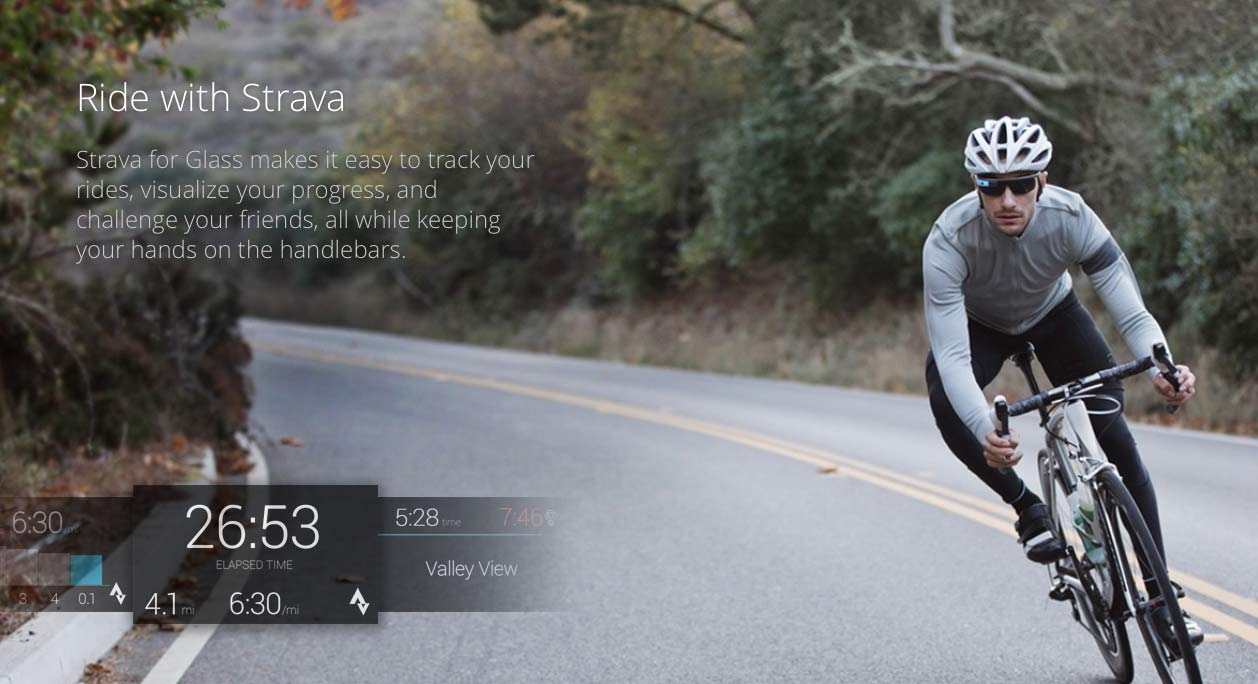 深受單車友和跑友歡迎的 Strava,他們開發的 Google Glass App 讓用戶可以毋須取出手機,直接在 Google Glass 的小屏幕上見到即時的資訊,包括速度和距離。當騎車者抬頭時,Strava App 還會提供詳細的分段表現報告。開發商認為,Google Glass App 可以讓騎車者在需要取得資訊時更方便,踩車時則更集中。Google Glass 版本的 Strava App 預計會在明年春季推出。